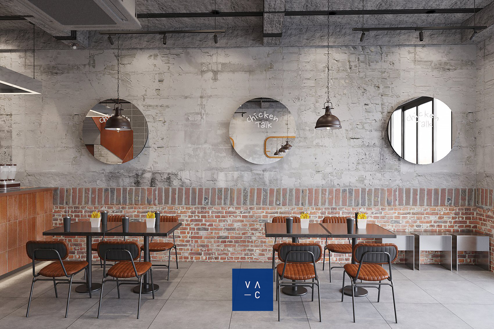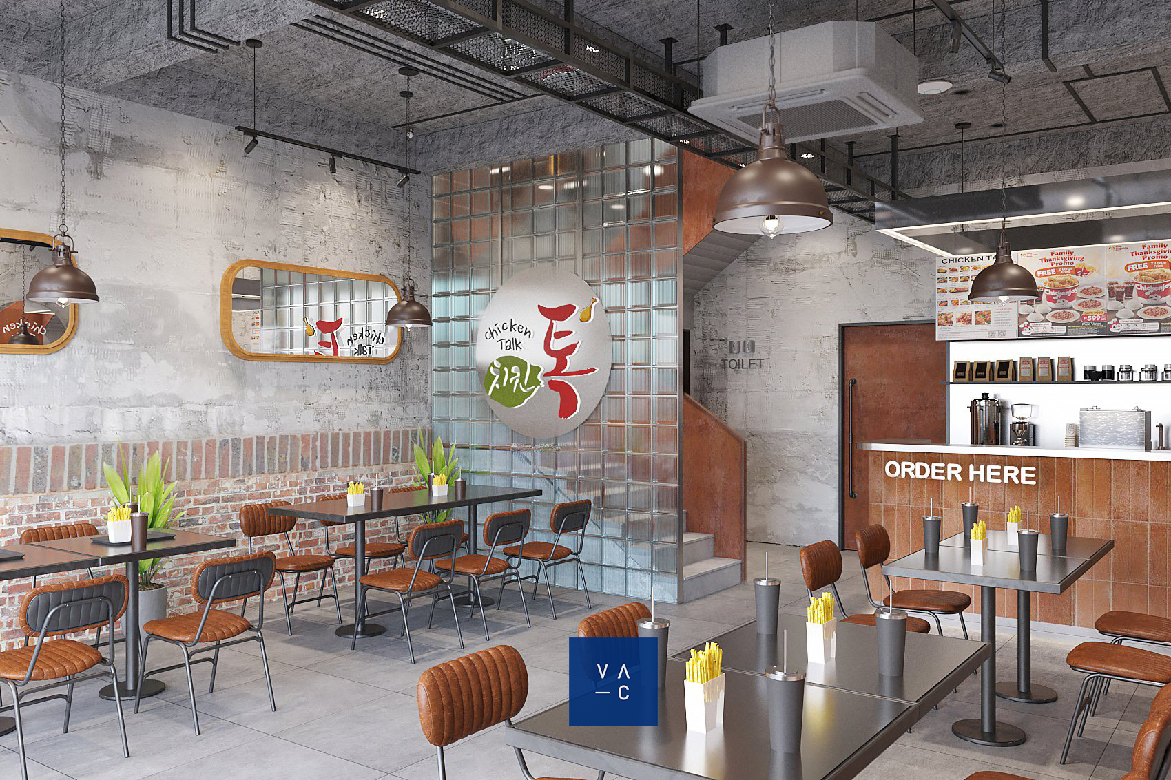 Chicken Talk ra đời với sứ mệnh mang đến một làn gió mới cho trải nghiệm ẩm thực tại Sóc Trăng. Với mong muốn tạo ra một không gian mới mẻ, VAC đã sử dụng những chất liệu thô mộc, kết hợp với ánh sáng tự nhiên để mang đến cảm giác gần gũi, ấm áp. Gam màu xám nhạt chủ đạo kết hợp cùng các chi tiết nâu trầm tạo nên một không gian vừa quen thuộc vừa lạ lẫm, đưa thực khách vào một hành trình trải nghiệm độc đáo.