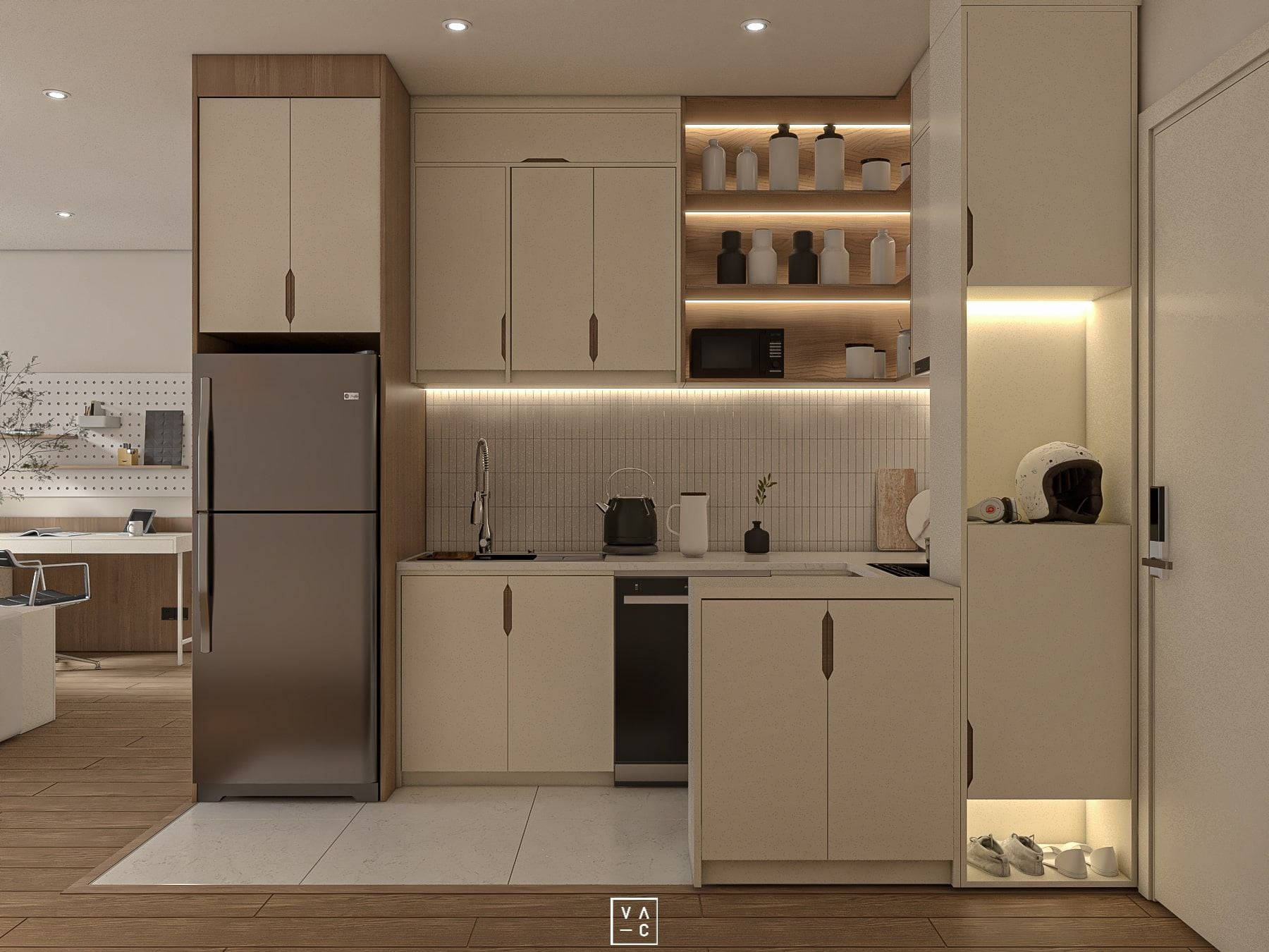 Một trong những điểm nhấn của dự án là việc thiết kế khu vực phòng khách liền bếp. Giải pháp này không chỉ giúp tiết kiệm diện tích mà còn tạo ra một không gian mở, giúp các thành viên trong gia đình có thể tương tác với nhau một cách tự nhiên và ấm cúng.