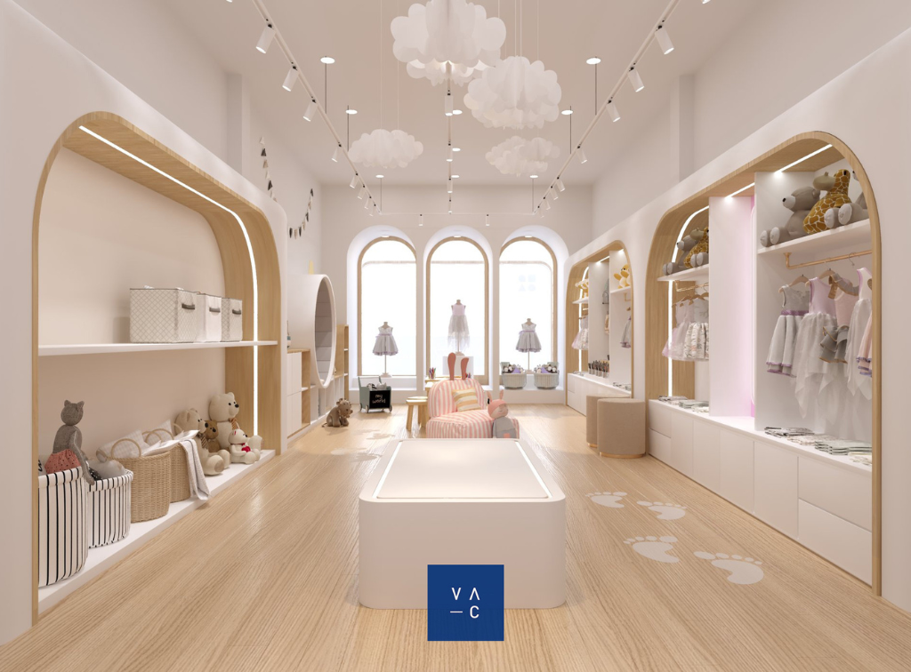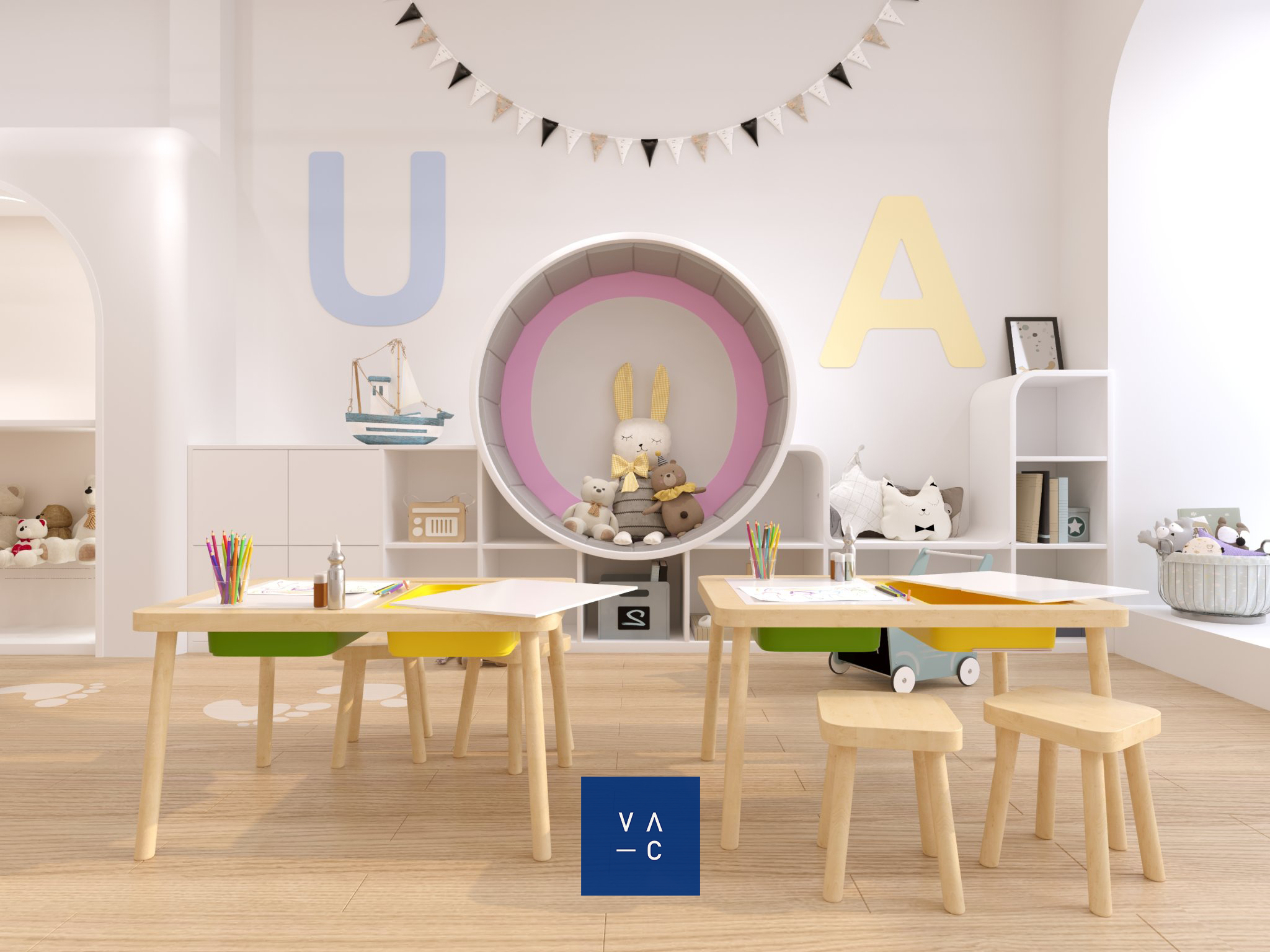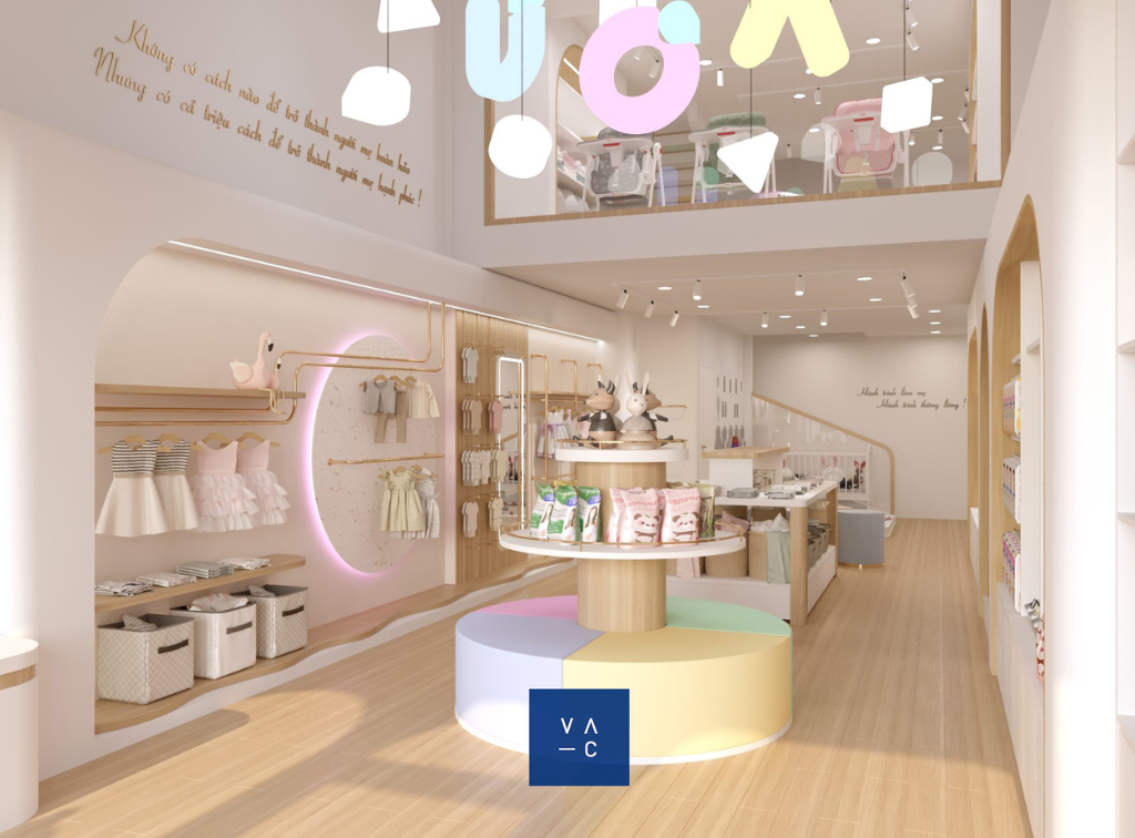 Ý tưởng thiết kế chủ đạo xoay quanh việc tạo ra một không gian vui tươi, ngập sắc màu và tràn đầy cảm hứng. VAC đã lựa chọn tông màu pastel nhẹ nhàng, kết hợp với các họa tiết hình học đơn giản để tạo nên một không gian vừa hiện đại, vừa ấm cúng.