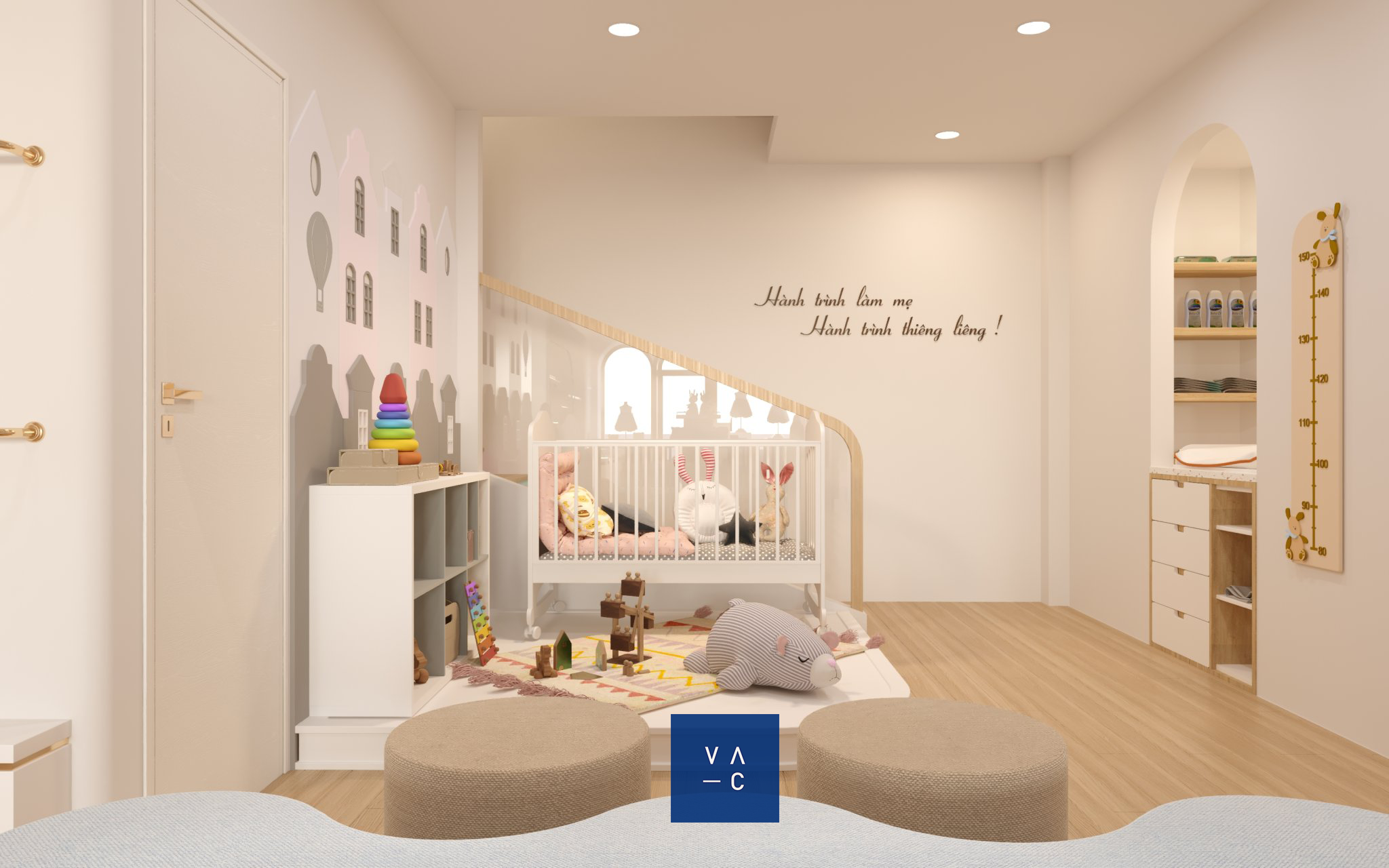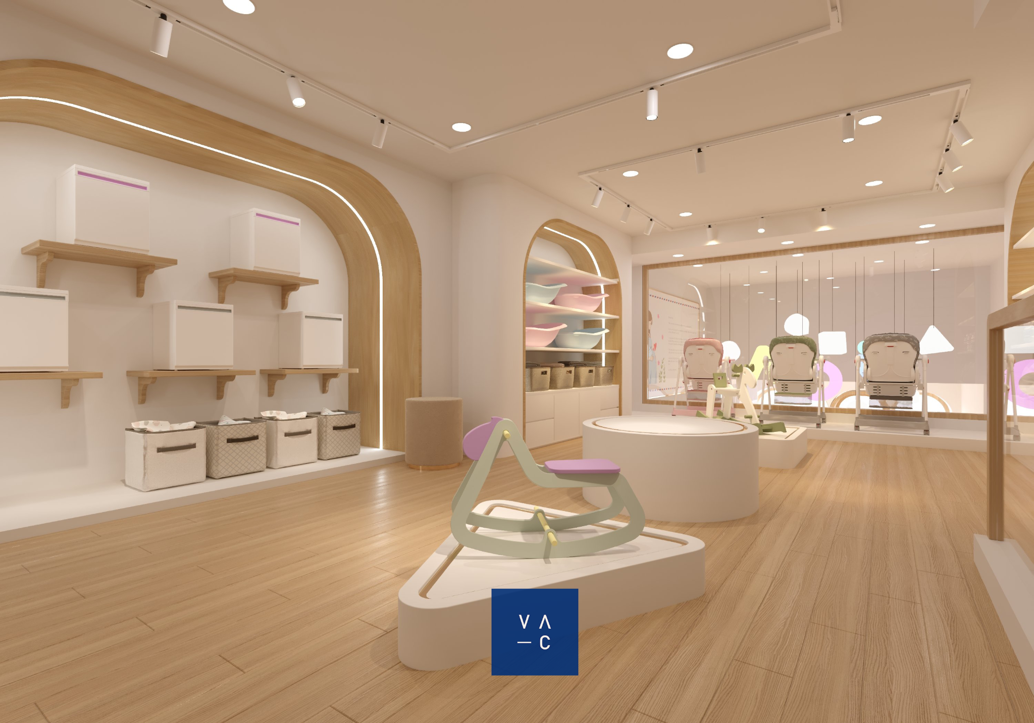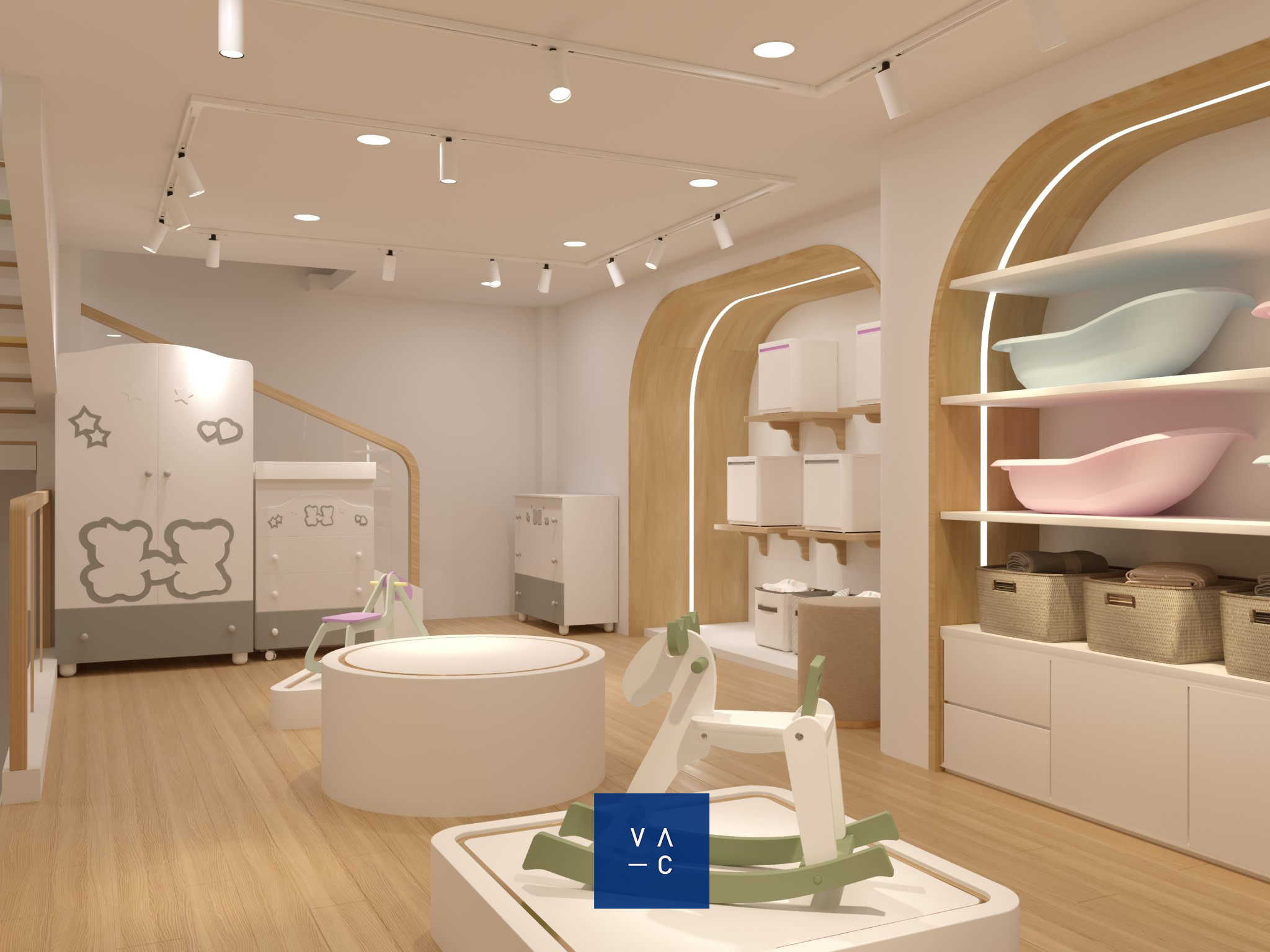 Ý tưởng thiết kế chủ đạo xoay quanh việc tạo ra một không gian vui tươi, ngập sắc màu và tràn đầy cảm hứng. VAC đã lựa chọn tông màu pastel nhẹ nhàng, kết hợp với các họa tiết hình học đơn giản để tạo nên một không gian vừa hiện đại, vừa ấm cúng.