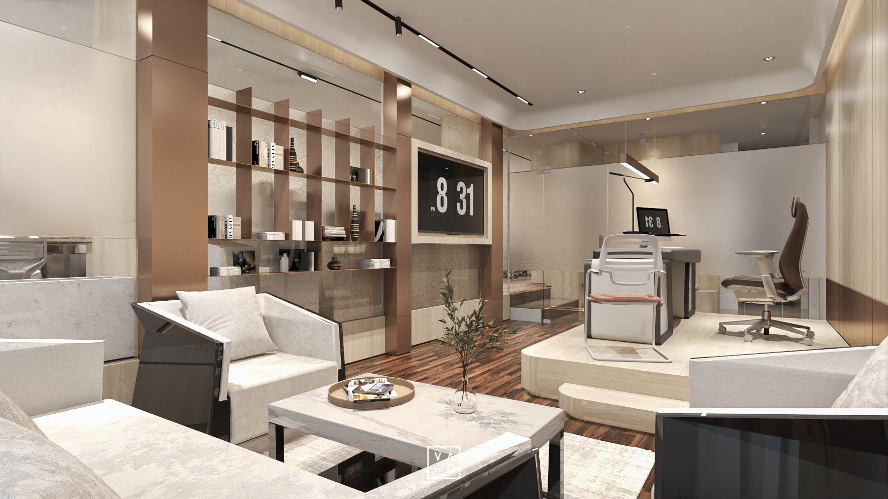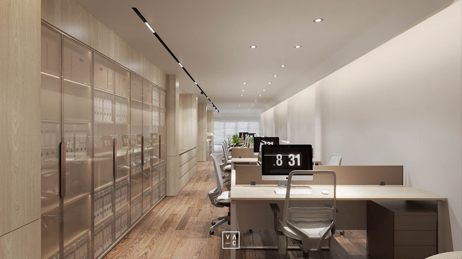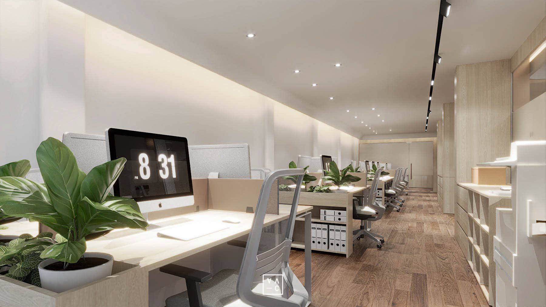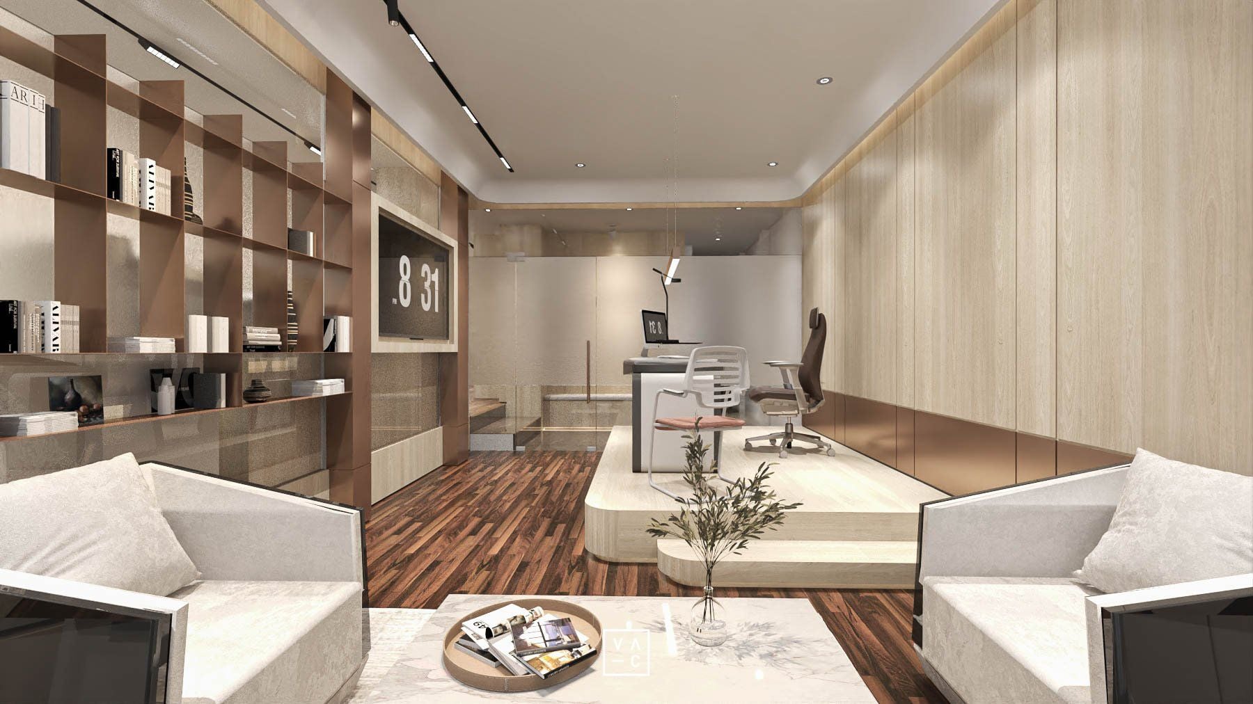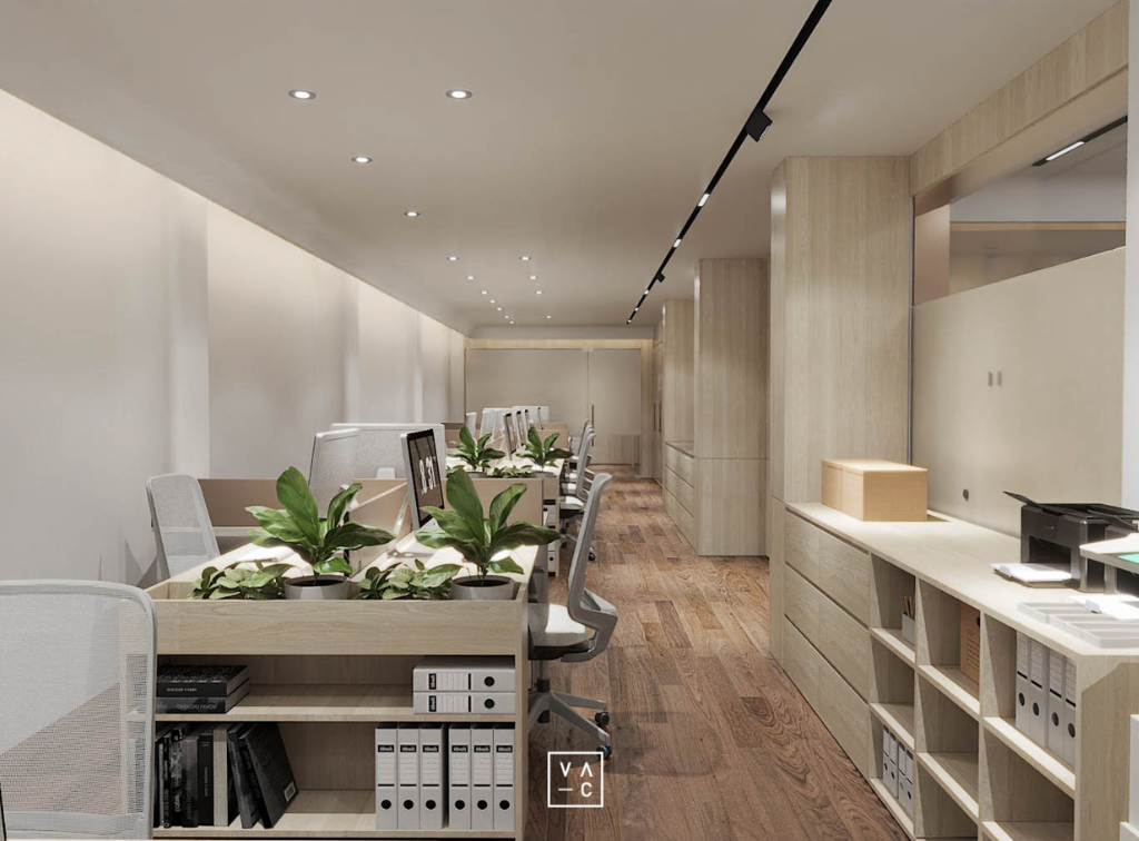 Điểm nhấn của không gian chính là sự kết hợp hài hòa giữa ánh sáng tự nhiên và hệ thống đèn chiếu sáng nhân tạo, tạo nên một không gian làm việc luôn tràn đầy năng lượng. Ứng dụng các vật liệu như gỗ và cây xanh không chỉ mang đến vẻ đẹp thẩm mỹ mà còn giúp tạo ra một môi trường làm việc trong lành, gần gũi với thiên nhiên.