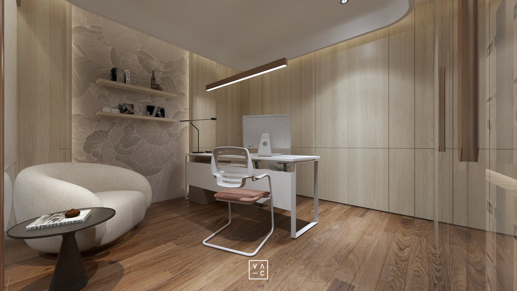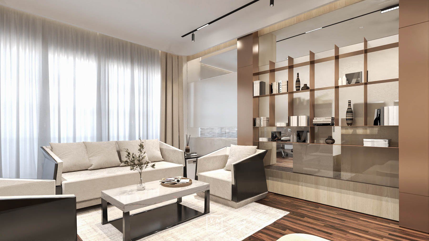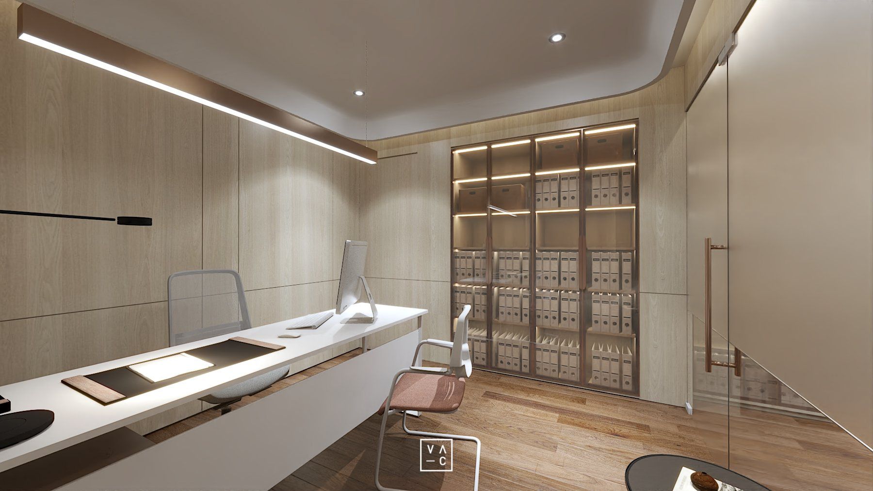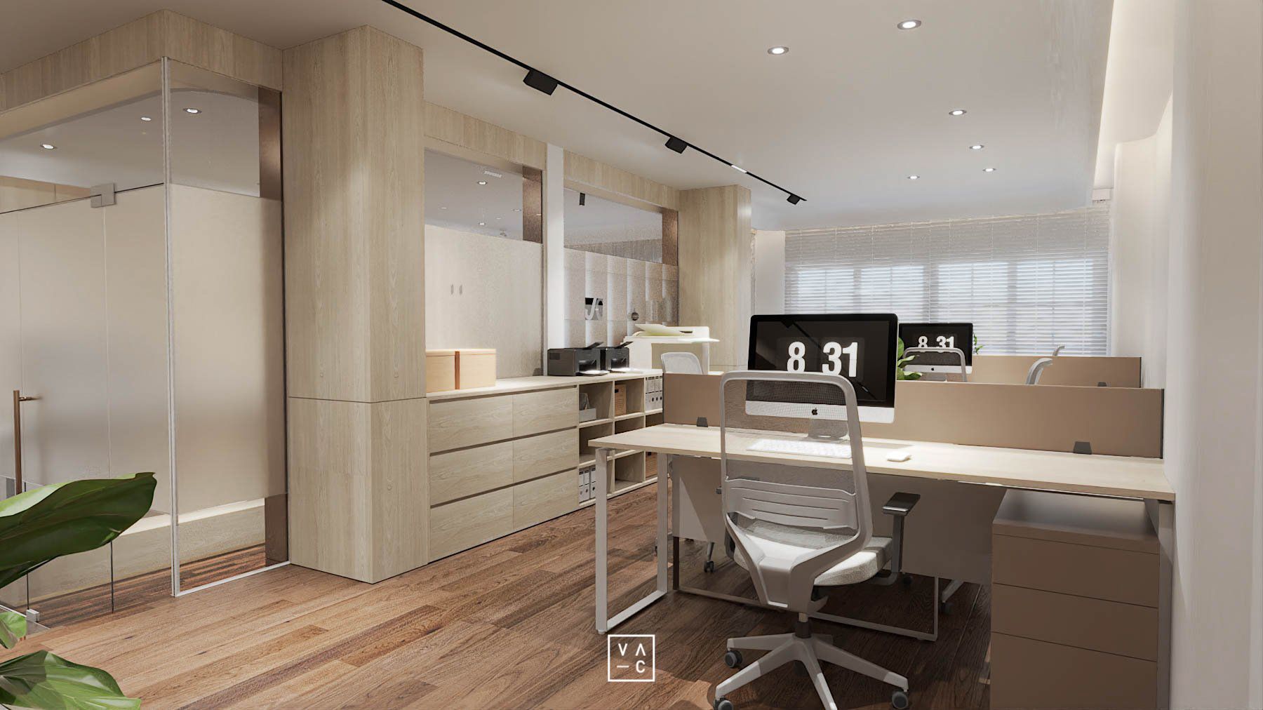 Điểm nhấn của không gian chính là sự kết hợp hài hòa giữa ánh sáng tự nhiên và hệ thống đèn chiếu sáng nhân tạo, tạo nên một không gian làm việc luôn tràn đầy năng lượng. Ứng dụng các vật liệu như gỗ và cây xanh không chỉ mang đến vẻ đẹp thẩm mỹ mà còn giúp tạo ra một môi trường làm việc trong lành, gần gũi với thiên nhiên.